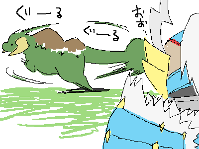 ドボル(瞳がチャーミング)の動きはゆっくりなので特に苦戦もせず…唯不思議な動きをするのが非常に気になるのである。離れて見てみたいと思ったのである。そんな時、彼がオトモを狙って離れて行った。かりともは〔小型優先〕なので離れている事が多々ある。チャンスである。私は後を追わずに観察する事にした。すると彼はハンマー投げの如く回り始め、宙に飛び上がり…ってドボルもアクロバティックだな!彼は私の視界から消え、次の瞬間、私は手痛い一撃を食らって吹き飛ばされていた…